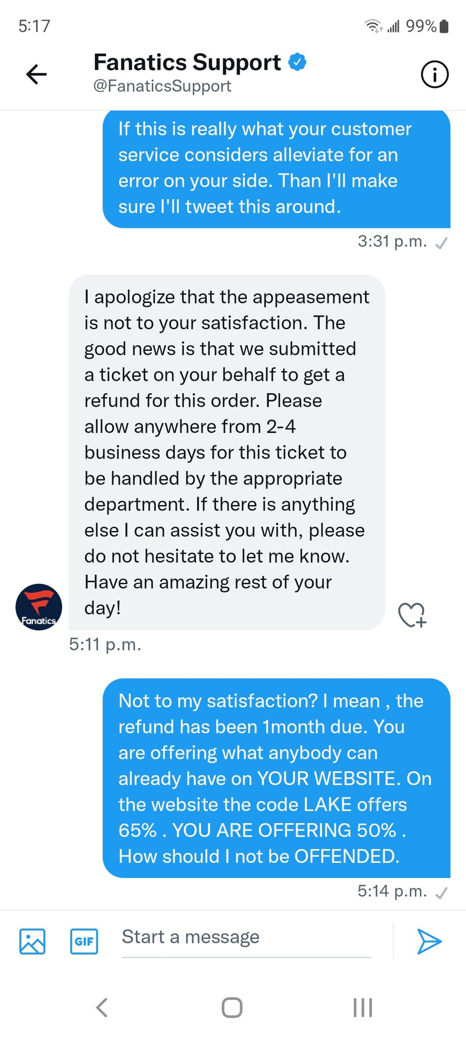 Fanatics Review: Hoodie and t-shirts - ComplaintsBoard.com Fanatics 73 complaints 31 resolved 42 unresolved File a complaint to Fanatics Fanatics contacts (added by reviewer) Phone number 1877 833 7397 Address 8100 Nations Way, Florida United States Website Category Online Shopping View all Fanatics contacts Most discussed complaints