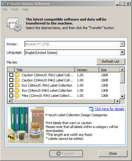 PT-2730 | LabelMakersPrinters | By Brother Prints up to 7 lines of text on each label. Select from 8 fonts, 10 type styles, and 17 frames. Save and print up to 99 of your favorite labels. Sleek, modern design with built-in automatic cutter. Complete kit: Includes AC adapter, software and drivers, USB cable, 0.94" (24 mm) starter "TZ" laminated tape, User's Manual. Downloads | P-TOUCH PC | United States | Brother For instructions to uninstall the printer driver, click here. 10/31/2001 (3.22) 0.53 MB: Editor Tool . Title Description Release Date (Version) Size; P-touch Editor3.x: This is an advanced software application to create and edit labels. 02/19/2003 (3.2.010) 8.33 MB: Support & Downloads. P-TOUCH PC. Not your product? Downloads; FAQs ... PDF For Windows Uninstalling the Software How To Use P-touch Editor 2730 Click [Start]-[All Programs]-[Brother P-touch]-[P-touch Editor 5.0]. In the [New/Open] dialog box, click [Help-How To]. Installing the Software and Printer Driver Uninstalling the Software and Printer Driver For Windows Installing P-touch Editor and Printer Driver The procedure for installing the software varies depending on the OS of the computer.