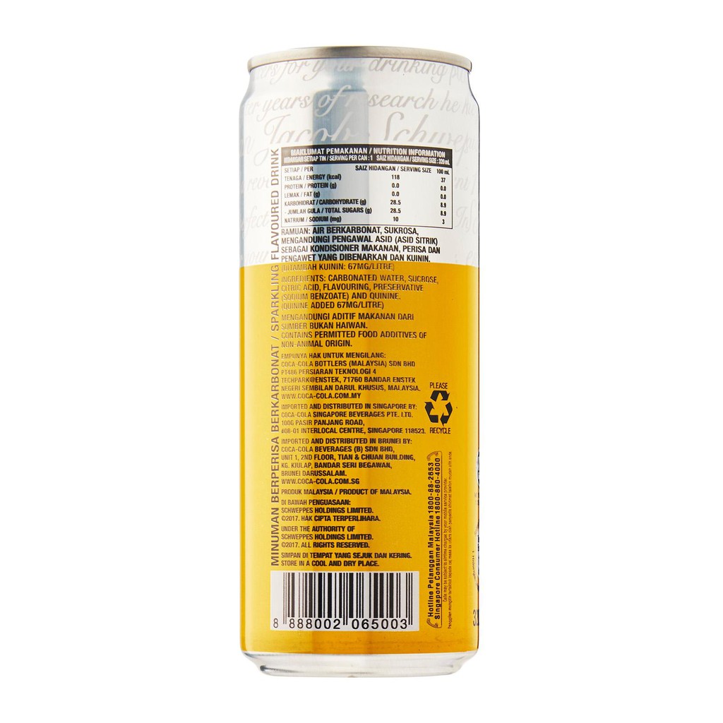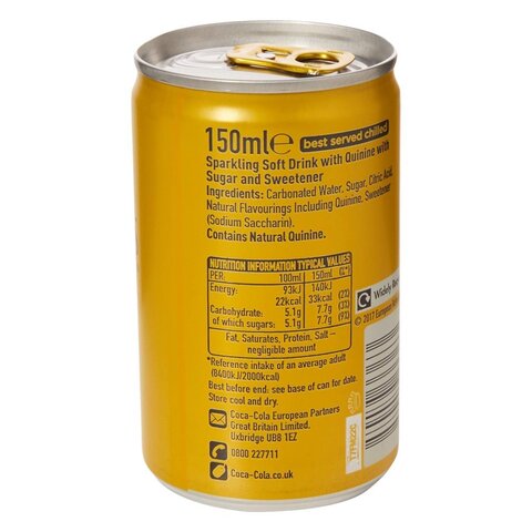 Schweppes Tonic Water: Calories, Nutrition Analysis & More - Fooducate Tonic water is carbonated water with quinine added. Quinine adds a bitter taste and also works against cramps. It may have some adverese effects too. Nutrition Serving Size: 250 ml Amount per Serving My Daily Value Calories 90 Kcal 5% Total Fat 0 g 0% Saturated Fat 0 g 0% Trans Fat 0 g 0% Sodium 35 mg 2% Total Carbohydrate 23 g 10% Sugars 22 g 31%