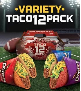 The Variety Taco 12 pack | Create a Pack! Taco Bell Variety Taco Party Pack. $18.99 Add to Order. 6. Crunchy Taco. 170 Cal Per Item. Customize Swap. 6. Nacho Cheese Doritos® Locos Tacos. 170 Cal Per Item. Customize. Stay Connected.