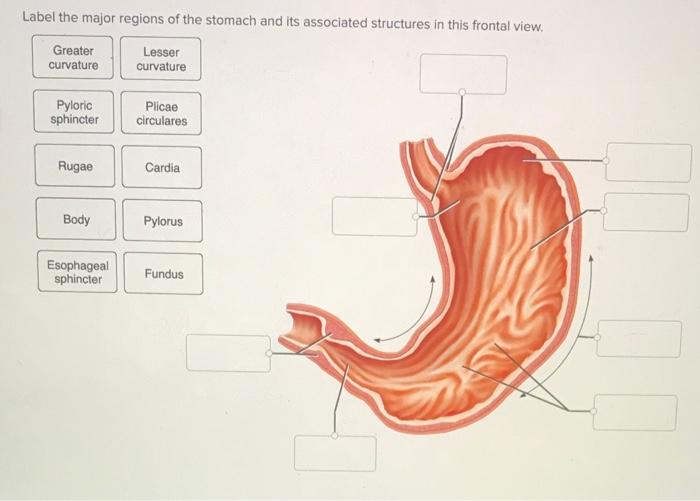 Solved Label the major regions of the stomach and its - Chegg Question: Label the major regions of the stomach and its associated structures in this frontal view. Greater curvature Lesser curvature Pyloric sphincter Plicae circulares Rugae Cardia Body Pylorus Esophageal sphincter Fundus This problem has been solved! See the answer Show transcribed image text Expert Answer 100% (5 ratings)