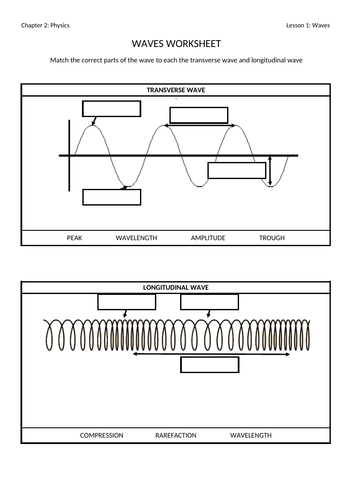 PDF Physics P Worksheet 9-4: Waves - Trunnell's Physics Physics P Worksheet 9-4: Waves Worksheet 9-4 Waves 1. The illustration below shows a series of transverse waves. Label each part in the space provided. a. _____ b. _____ c. _____ d. _____ e. _____ f. _____ g. _____ Fill in the blanks: 2. Waves carry _____ from one place to another. 3. The highest point on a transverse wave is the _____ while the lowest part is the Anatomy of a Wave for High School Students - Explore Sound Walk around listening as the students instruct the artists. Anatomy of a Wave: part 2. Collect the wave sheets from the reporters and ask the artists to turn their picture over. The reporters should get out a blank piece of paper. Do the activity again, but this time, you give the instructions for all the students to draw this time. PDF The Power of Waves - Oak Ridge Institute for Science and Education One copy of PhET "Wave on a String" Worksheet per student One copy of CER worksheet per student . Instruction . PART ONE: Engage and review prior knowledge using an engaging phenomenon, a DrivingQuestion ... so it is intuitive to students that the compression part of a longitudinal wave is the "smooshed together" portion, as my students ... PDF Name: Date: Anatomy of a Wave Worksheet - TeachEngineering On separate sheets of graph paper, draw four different waves with the following measurements. Label the parts and include the measurements. wave # crest trough wavelength 1 1 cm 1 cm 2 cm 2 3.5 cm 3.5 cm 2.5 cm 3 .5 cm .5 cm 3 cm 4 2 cm 2cm .5 cm Concluding question: State which wave you think has the highest frequency and which might have the lowest frequency. Explain the reasons for your selections.