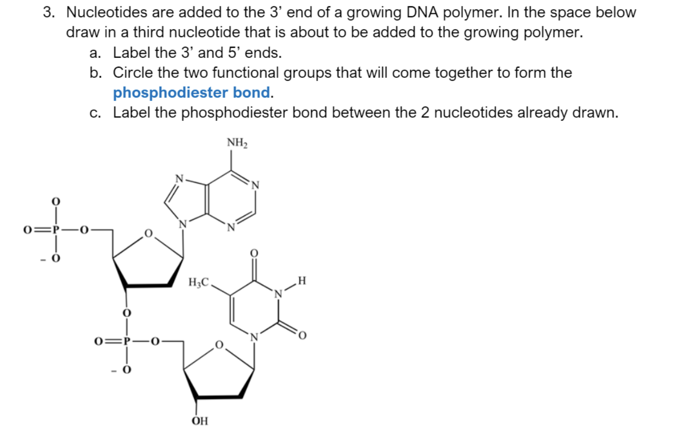 Solved 1. a. Draw a guanylate nucleotide and label the three - Chegg Draw an adenylate residue bonded to the guanylate from below as it would be in a nucleic acid chain f. Label the phosphodiester bond 8. Label which side of your dinucleotide is the 5' and 3' side h. Solved . What are the three chemical components of a | Chegg.com Draw and label these on the structures of a double ring and a single ring nucleotide. Label all atoms other than carbon or hydrogen (e.g. nitrogen, oxygen, phosphorous). Be sure to draw double bonds where present. (4 pt) 4. Draw the structure of the chemical linkage that connects nucleotides in a nucleic acid DNA or RNA) polymer (I pt).