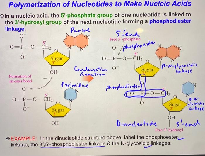 Biology Learning Goals - Nucleotides and nucleic acids - Quizlet Draw and label a diagram to show how nucleotides can link together to form polynucleotides (including the production of water). State the name of the reaction that joins nucleotides to other nucleotides and the name of the reaction that breaks phosphodiester bonds. Form by condensation reaction Break by hydrolysis