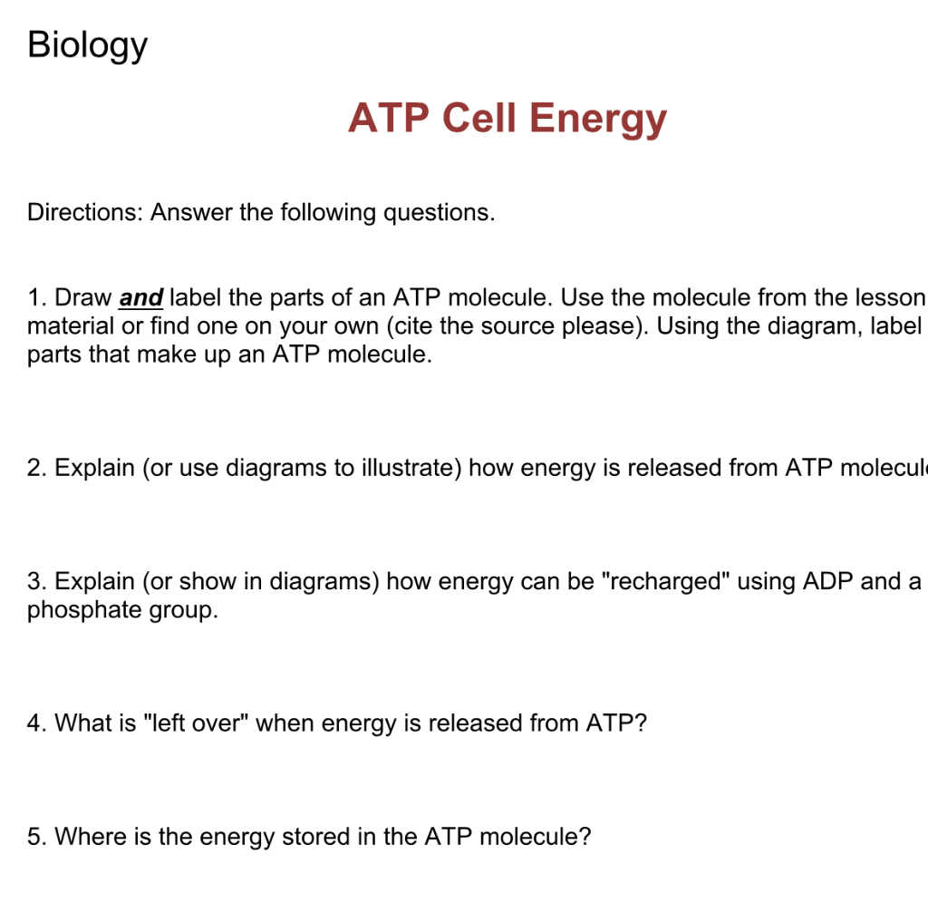 Solved Biology ATP Cell Energy Directions: Answer the | Chegg.com