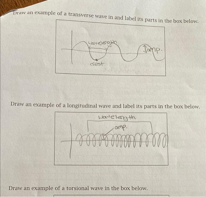 Transverse wave | Definition, Characteristics, Examples, Diagram ... transverse wave, motion in which all points on a wave oscillate along paths at right angles to the direction of the wave's advance. Surface ripples on water, seismic S (secondary) waves, and electromagnetic ( e.g., radio and light) waves are examples of transverse waves. Study Guide for Waves Test Flashcards | Quizlet Draw a transverse wave and label the following parts: amplitude, wavelength, crest, and trough. Draw and label a longitudinal wave. Include compression, rarefaction and wavelength Give examples of the waves drawn in #1 and #2.