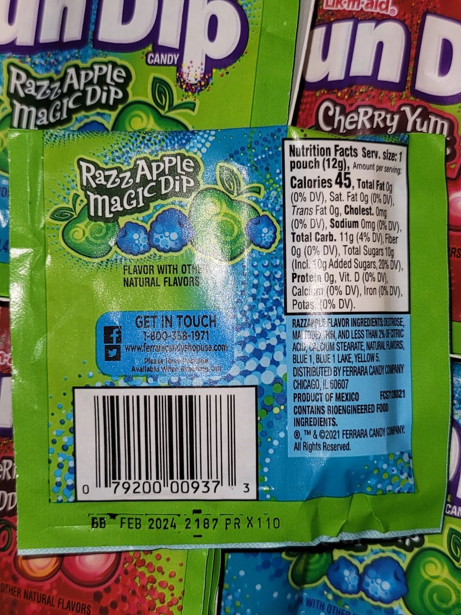 Fun Dip - Fun Dip, Candy (48 count) | Online grocery shopping ... Nutrition Facts Serving Size 1 pouch Amount Per Serving Calories 45 % Daily Value* Total Fat 0g Includes 0g Total Fat Sodium 0mg Includes 0mg Sodium Total Carbohydrate 11g Includes 11g Total Carbohydrate 4% Added Sugars 10g Includes 10g Added Sugars 20% Protein 0g Includes 0g Protein