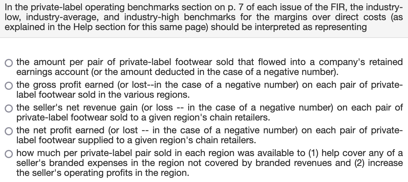 In the private-label operating benchmarks section on p. 7 of each issue ... In the private-label operating benchmarks section on p. 7 of each issue of the FIR, the industry-low, industry-average, and industry-high benchmarks for the margins over direct costs (as explained in the Help section for this same page) should be interpreted as representing A. the net profit earned on each pair of private-label footwear sold in a given region.