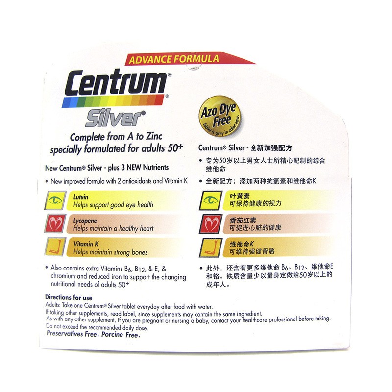 Centrum Silver With Lutein | Haleon HealthPartner Centrum Silver With Lutein is based on an age-adjusted formula to help meet the nutritional needs of adults 50 years of age and older. It supplies B vitamins to support heart and brain health, vitamins A, C, and E, and lutein to help maintain eye health, and zinc and beta carotene to support the immune system. In addition, Centrum Silver Adults ...