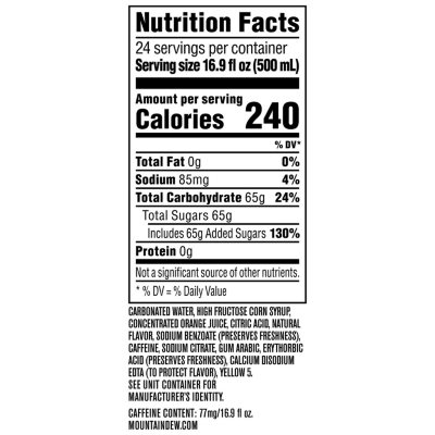 Mountain Dew Soda 16.9 Bottles - Shop Soda at H-E-B Caffeine Content: 36 mg/8 fl oz; 77 mg/16.9 fl oz. Preparation instructions. Best taste drink by date on bottle. Ingredients Carbonated Water, High Fructose ... The Facts About Your Favorite Foods and Beverages (U.S ... Serving Size 20 fl oz (591 mL) Caffeine 91mg Phosphorus 0 mg (0% DV) Sweeteners: High Fructose Corn Syrup Additional package sizes Click to view 20 fl oz 7.5 fl oz 8 fl oz 12 fl oz 16 fl oz 16.9 fl oz 24 fl oz 33.8 fl oz 42.3 fl oz 67 fl oz Freeze Fountain mountaindew.com Where To Buy Product Fact Sheet Calories in Mountain Dew - Nutritionix Mountain Dew Nutrition Facts Serving Size: fl oz ( 473g ) Mountain Dew Amount Per Serving Calories 232 % Daily Value* Total Fat 0g 0% Saturated Fat 0g 0% Trans Fat 0g Polyunsaturated Fat 0g Monounsaturated Fat 0g Cholesterol 0mg 0% Sodium 85mg 4% Total Carbohydrates 61g 22% Dietary Fiber 0g 0% Sugars 61g Protein 0g Vitamin D 0mcg 0% Mtn Dew 16.9 Oz Bottle - Nutrition Facts - MyNetDiary Nutrition Facts · Total Fat 0g · Saturated Fat 0g · Trans Fat 0g · Polyunsaturated Fat 0g · Monounsaturated Fat 0g · Cholesterol 0mg · Sodium 85mg · Total Carbs 65g.